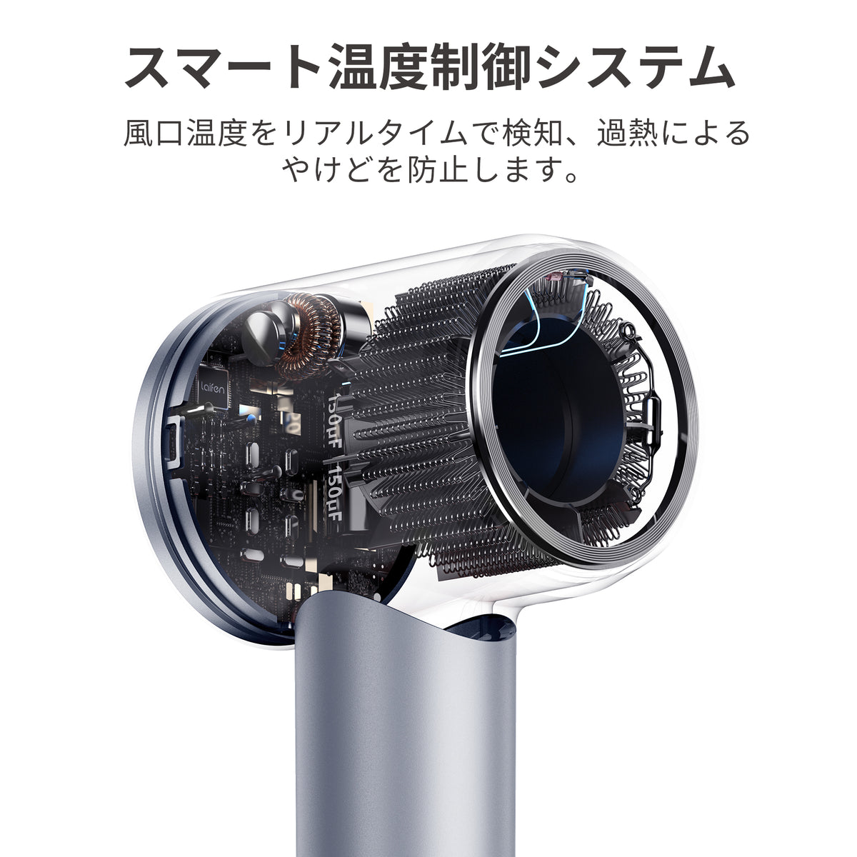 スマート温度制御システム | 温度センサーが風温度を100回/秒測定し、温度を一定に保ちながらコントロール。熱ダメージを防ぐ。 |